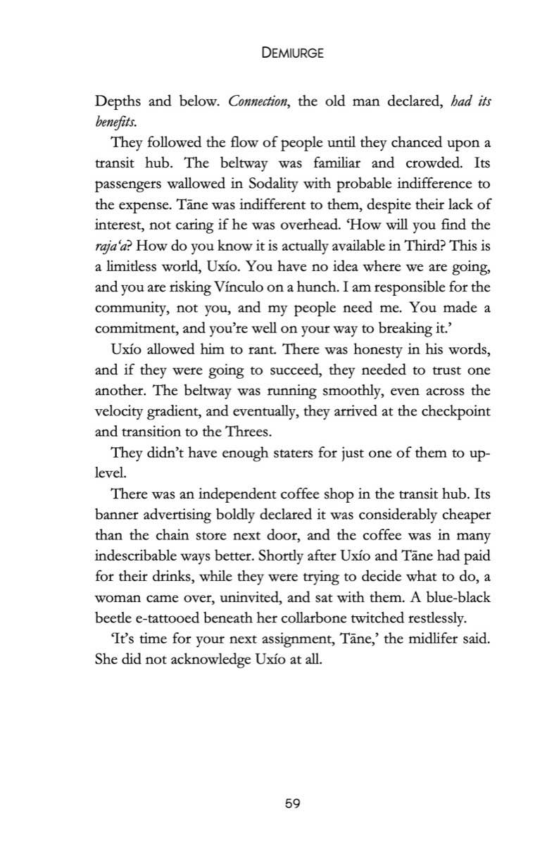 Click on the front cover and enjoy the first chapter of Demiurge, available from online stores.